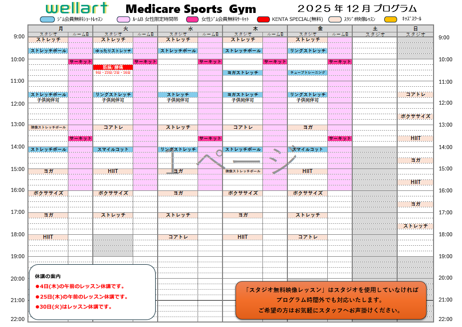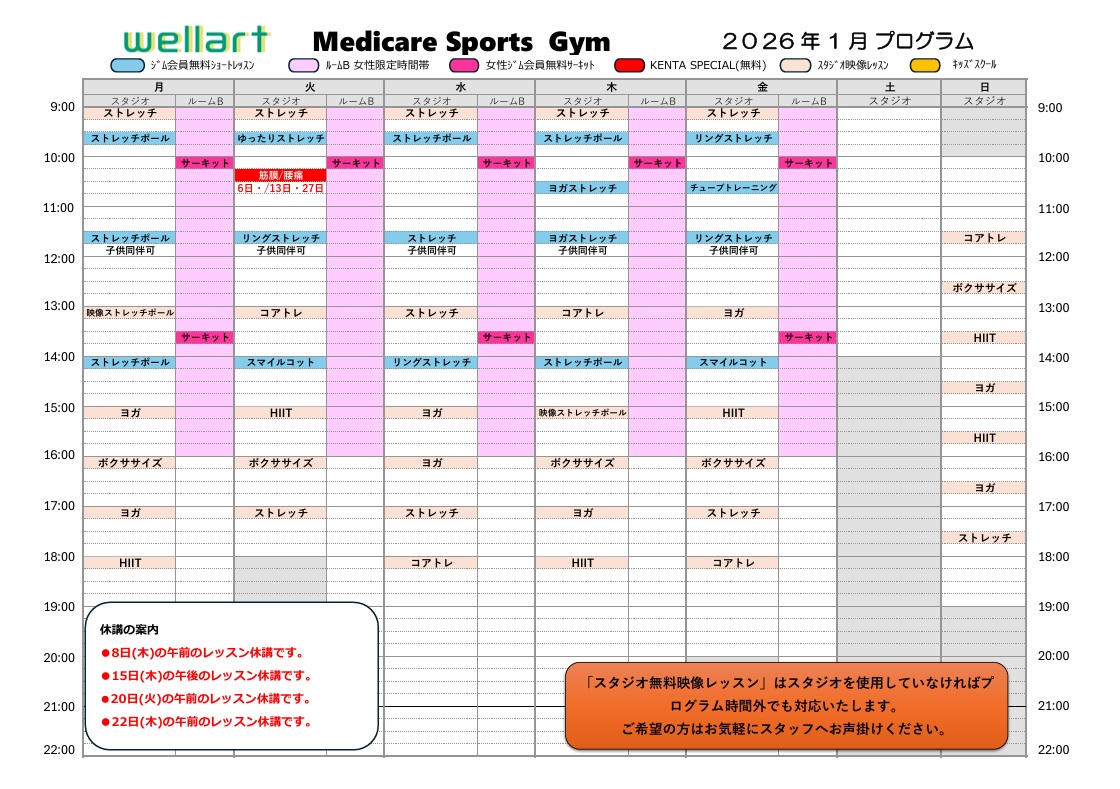 スタジオレッスンは、ヨガ・エアロビクス・キックボクシング・フラメンコを開講中。『習い事』として、週1回のペースで参加していただくレッスンです。『ジムは要らない。ヨガだけやりたい』というお客様にピッタリです。